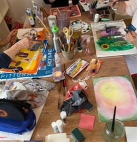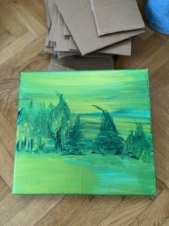 Vi målar bl.a. på kartong som finns här. Inga förkunskaper krävs. Här finns plats för lekfullhet, stillhet och skaparglädje.